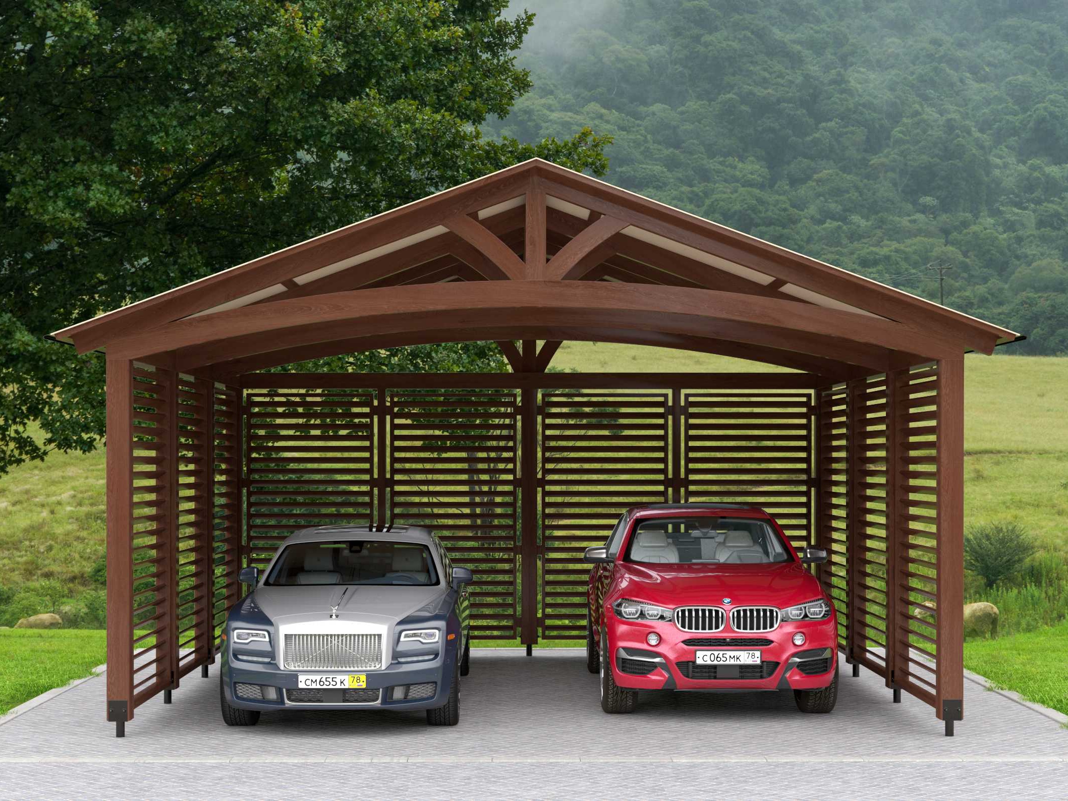 Поэтому компания "НавесСтрой" настоятельно рекомендует не экономить, а усилить каркас навеса для двух автомобилей более жёсткими профилями с увеличенной толщиной металла и количеством несущих ферм.