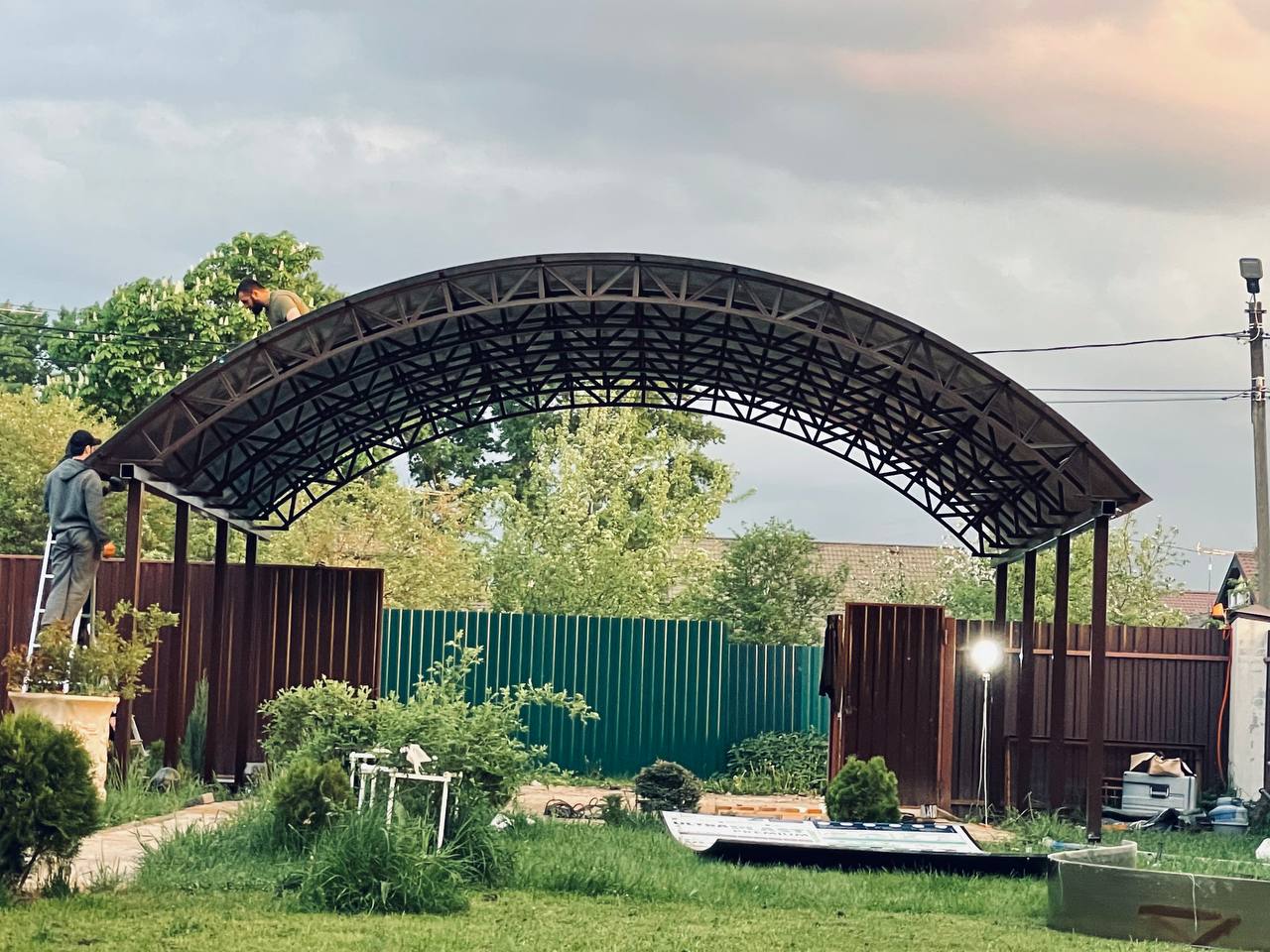 За день на даче изготовили арочный навес 5 на 7 с покрытием поликарбоната. Привезли уже готовые крашенные фермы и весь остальной материал. Все за собой убрали и увезли мусор. Молодцы!
